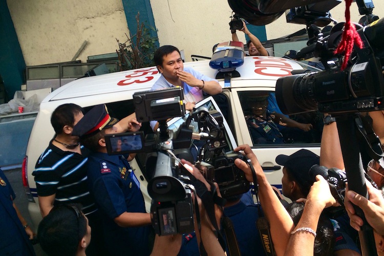 Before getting inside the police car that would take him to the PNP Custodial Center, Estrada savored his last few minutes of freedom - for now – by stepping on the car as he blew kisses and waved at the media.